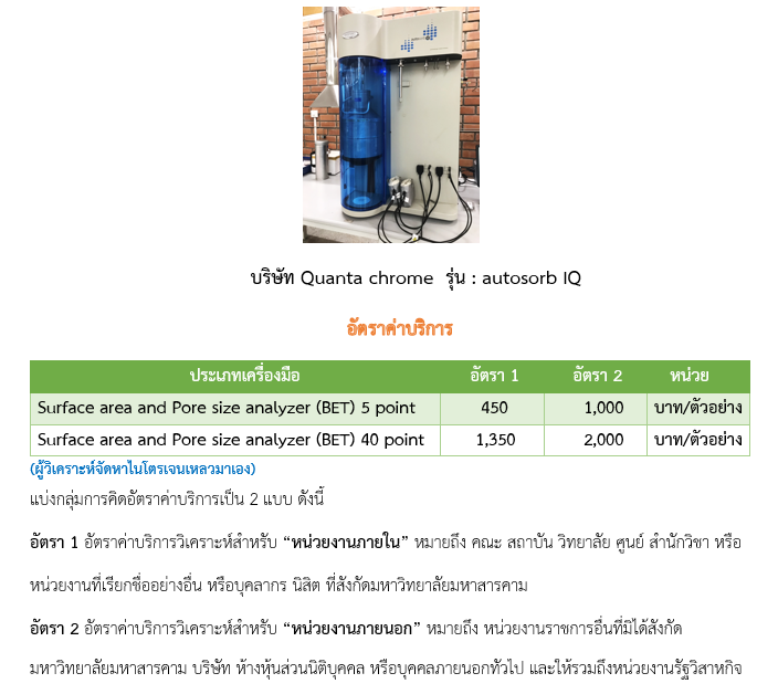 เครื่องวัดพื้นที่ผิวและความพรุน ยี่ห้อ : Quanta chrome รุ่น : autosorb IQ วัตถุประสงค์การใช้งาน : ชุดวิเคราะห์คุณลักษณะพื้นที่ผิวเป็นเครื่องมือศึกษาคุณสมบัติทางกายภาพและเคมีของตัวอย่าง เพื่อวิเคราะห์หาขนาดเส้นผ่านศูนย์กลางของรูพรุน (Pore size diameter) พื้นที่ผิวของผงตัวอย่าง (Surface area) ปริมาตร ของรูพรุน (Pore volume) ในแบบต่างๆ (Micropore, mesopore and macropore) ค่าการดูดซับหรือคายก๊าซ (adsorption / desorption isotherm) และการดูดซับทางเคมี (Chemisorption) โดยใช้หลักการ Vacuum Volumetric Technique สามารถแปรผลการวิเคราะห์คุณสมบัติของอนุภาคได้ดังต่อไปนี้ Adsorption/desorption isotherm, BET method, Langmuir method, α S method, t method, MP method, BJH / CI / DH method, DA method, differential adsorption isotherm, dead volume measurement method, Horvath-Kawazoe method, SaitoFoly method, molecular probe method ความสามารถของเครื่อง/ความละเอียด : สามารถวัดพื้นที่ผิวของตัวอย่างได้ตั้งแต่ 0.01 M2/G ขึ้นไป, สามารถวัดรูพรุนที่มีเส้นผ่านศูนย์กลางของรูพรุนตั้งแต่ขนาด 0.35 NM ถึง 500 NM