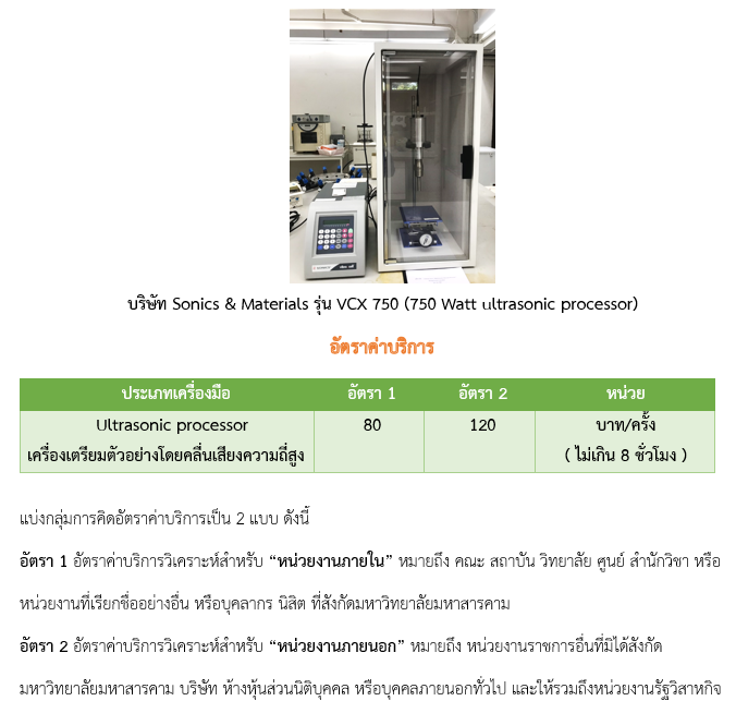 Ultrasonic processor : เครื่องเตรียมตัวอย่างโดยใช้คลื่นเสียงความถี่สูง เป็นเครื่องมือที่สามารถก่อให้เกิดคลื่นความถี่สูง ที่สามารถใช้ในงานการเตรียมตัวอย่าง เช่น การทำให้เซลล์แตก,การแตกตัว,การทำให้เป็นเนื้อเดียวกัน,การลดขนาดของอนุภาค,การทดสอบตัวอย่างดิน,การเร่งปฏิกิริยาเคมี และอื่นๆ ตัวเครื่องสามารถก่อให้เกิดคลื่นเสียงความถี่สูงขนาด 130 watts และสามารถใช้กับตัวอย่างได้ในช่วง 150 µl 150 ml