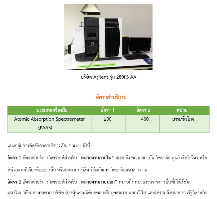 วัตถุประสงค์การใช้งาน : เครื่อง AAS เป็นเครื่องมือที่ใช้ในการวิเคราะห์ธาตุที่อยู่ในรูปสารละลาย ด้วยเทคนิค Atomic Absorption Spectroscopy ซึ่งเป็นกระบวนการที่อะตอมอิสระของธาตุ ดูดกลืนแสงที่ความยาวคลื่นระดับหนึ่งที่เฉพาะกับธาตุแต่ละธาตุ ความสามารถของเครื่อง/ความละเอียด : AAS สามารถวิเคราะห์ในระดับ ppm